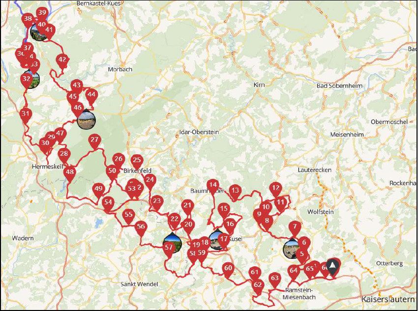 Verlauf: Baumholder- Birkenfeld – Hermeskeil – Piesport (Mosel) – Türkismühle – Wahnwegen